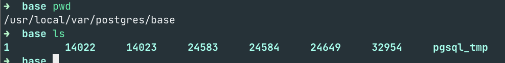 With the Object identifier(oid) that Postgres creates for a resource, we can navigate to the Postgres data directory ($PGDATA/base) and see a folder with the same ‘oid’. If you aren’t sure on the location of data directory use “Show data_directory”