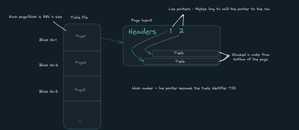 Each file is a logical split into blocks/Pages which are 8KB in size . Each block has a bunch of headers and Tuples(row data). If you have a table with say 1000 rows with 3 columns, they could be stored across multiple pages within the file.