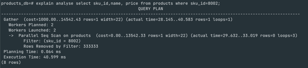 As you see postgres loads the index file into memory and fetches only the pages that match the condition ‘sku=8002’. In this case it just loads 1 page – ‘page no – 200’ and uses the offset to get to the data and hence the high difference in execution time.