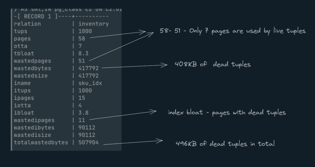 All tuples that has ‘xmax‘ value non-zero are dead tuples. In the above usecase, you will see that for 1000 live tuples, there is 3X dead tuples increasing the no of pages for tables and indexes.