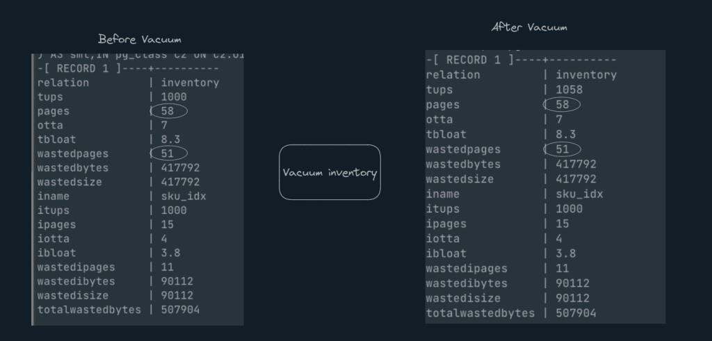You can also run ‘Vacuum <<table name>>’ command to kickstart the vacuum process manually or as part of archive job. Let’s try to execute this on the inventory table and see the result