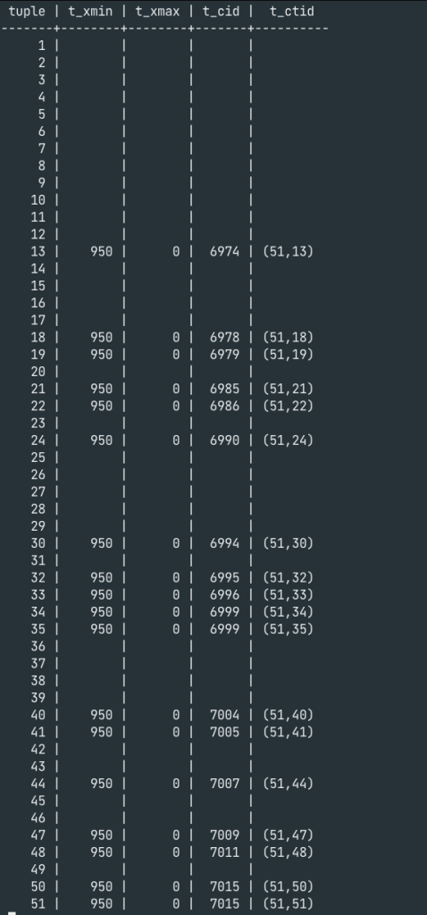The empty space in tuples 36 through 39, for example, shows that the dead tuples have actually been eliminated. Obviously, this can be used to fill in the newer rows. But can’t Postgres make fewer pages with only live tuples instead of 58 pages with empty space?