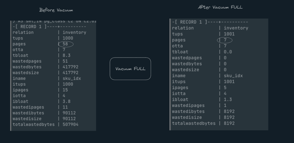 Note: – ‘Vacuum full‘ takes a table level lock which will impact any read/write queries happing on this table for other clients. hence, its recommended to run ‘Vacuum Full‘ only during off-peak hours or during maintenance window.
