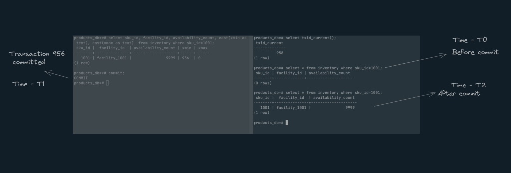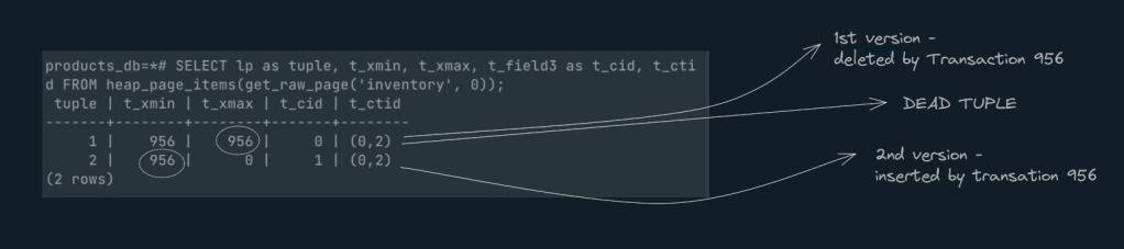 As you see, the new row is part of a tuple whose ‘xmin‘(956) is pointing to the transaction-id(956) which created it.