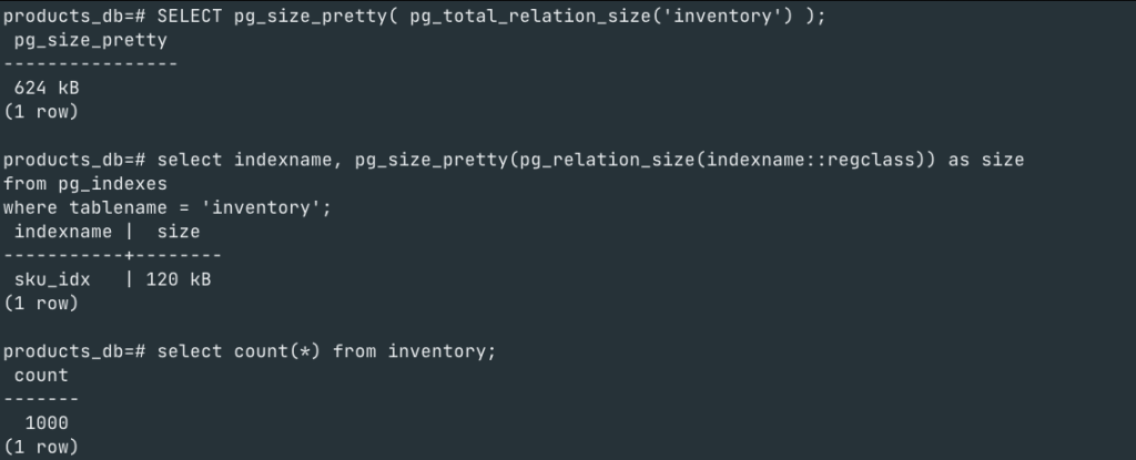 If you notice, we have not inserted any new rows, the same 1000 rows remain, however the table size on disk has increased 4x to what it was and the index size has increased 3X to what it was.